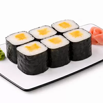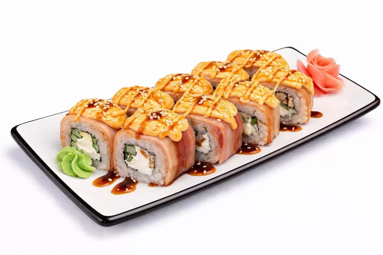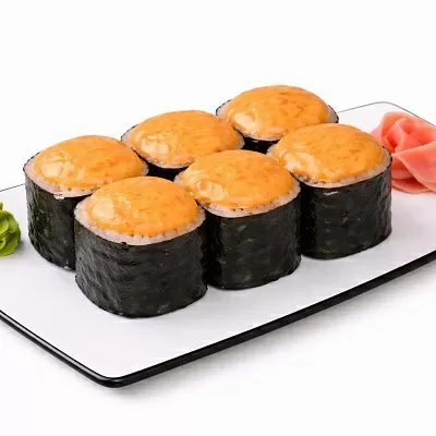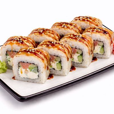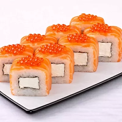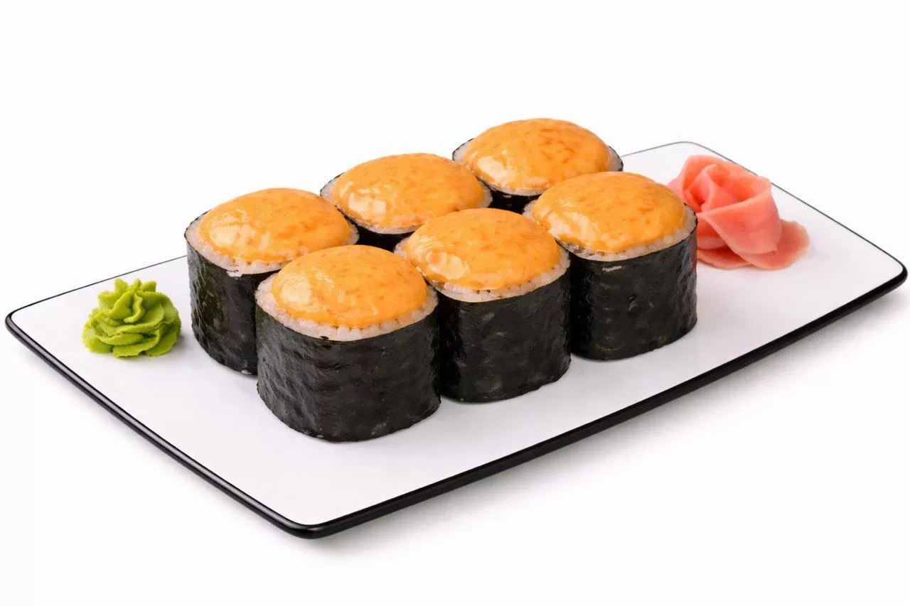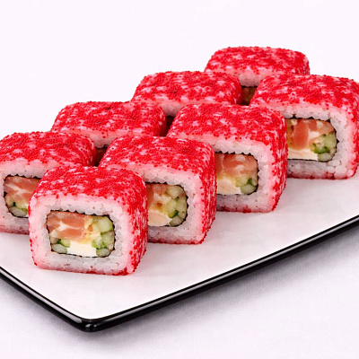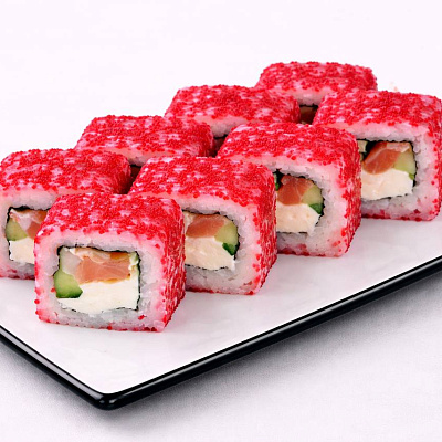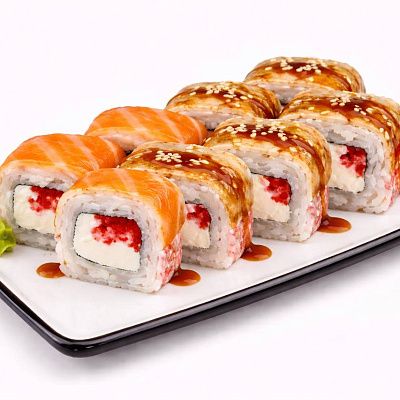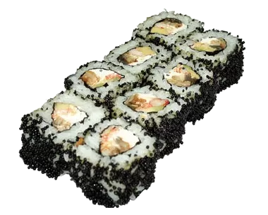 Красная икра тобико, куриное филе, омлет, перец болгарский, сырный соус, унаги соус, кунжут белый и черный.