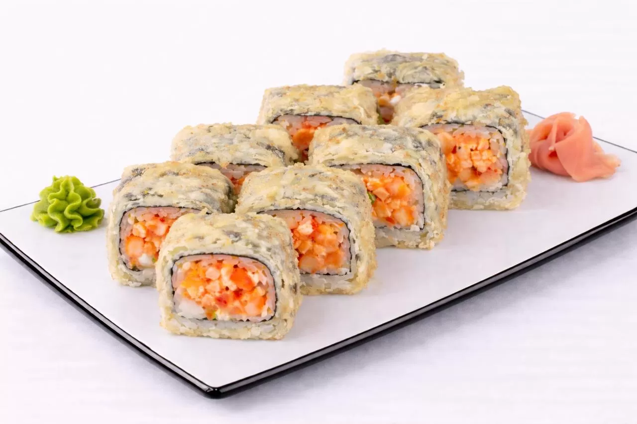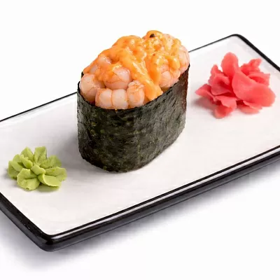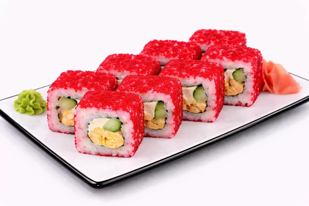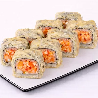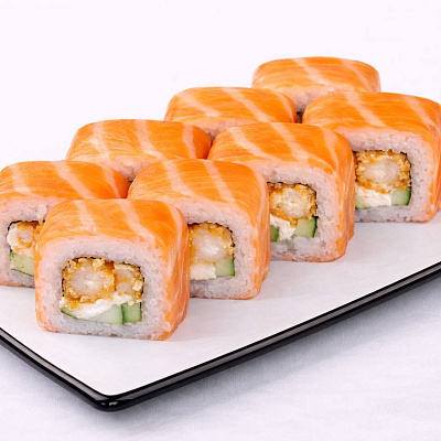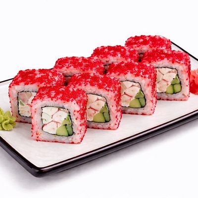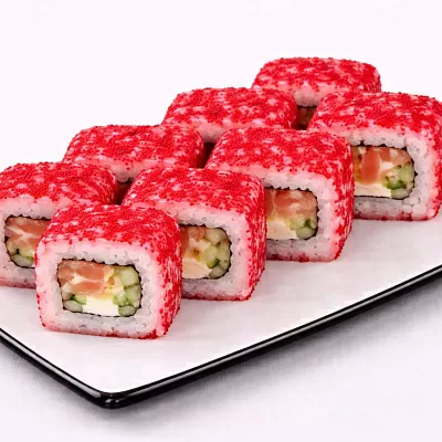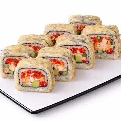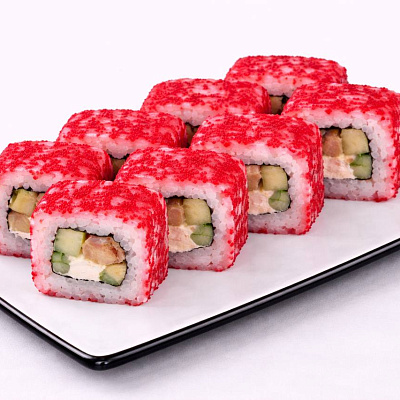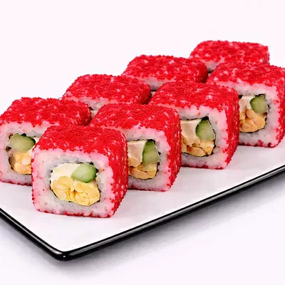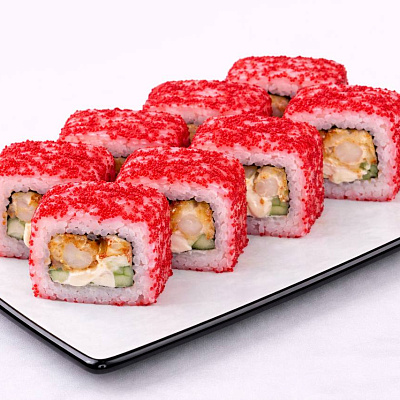 Темпурная креветка, красная икра тобико, огурец, спайси соус, сырный соус, унаги соус.
