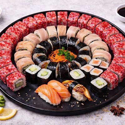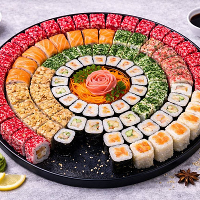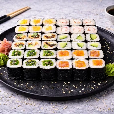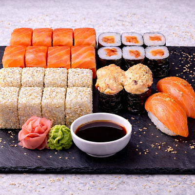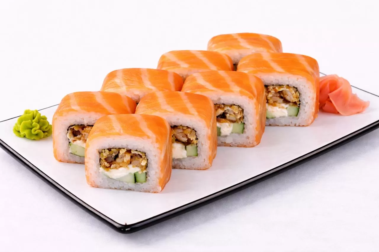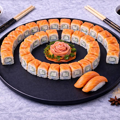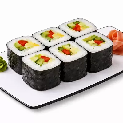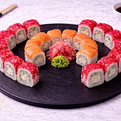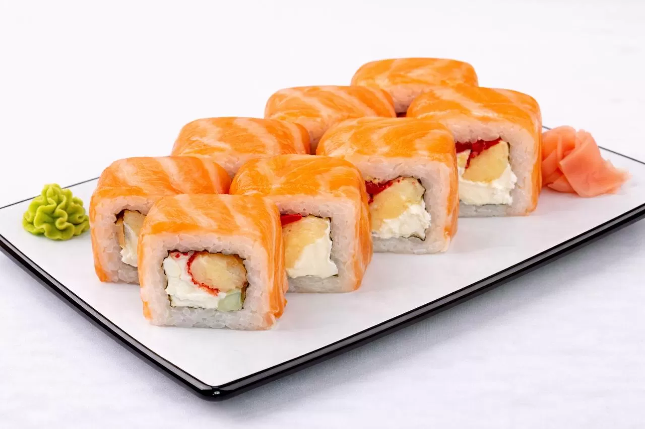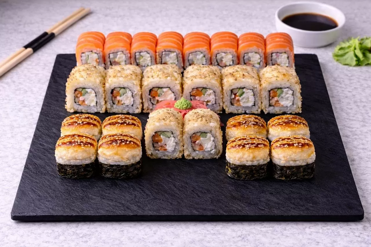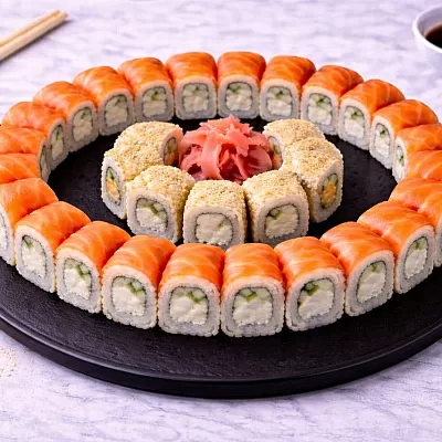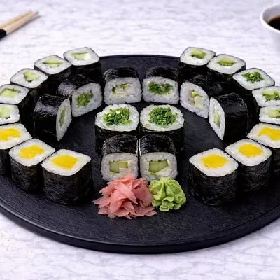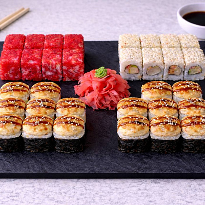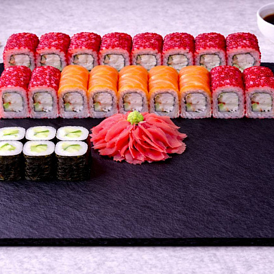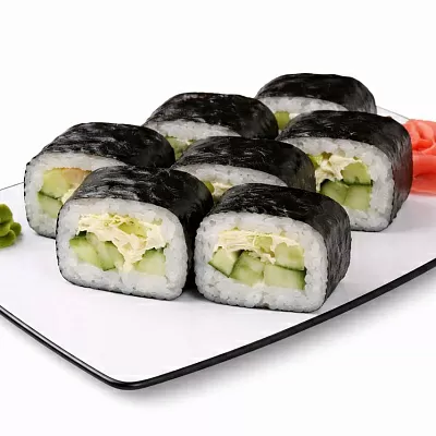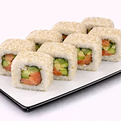 Роллы: Фреш ролл, Калифорния, Фудзи, Сяке кунсей маки, Буто маки, Лосось, Огурец.