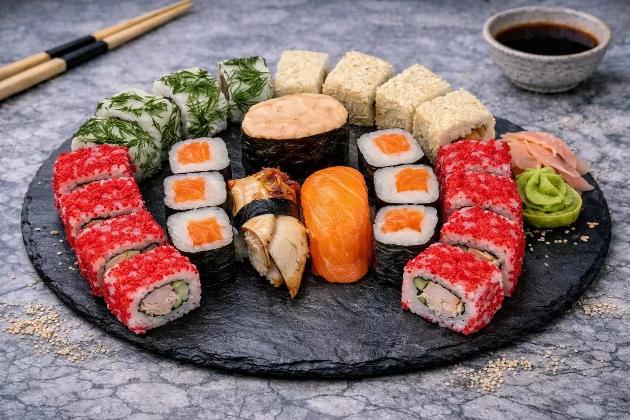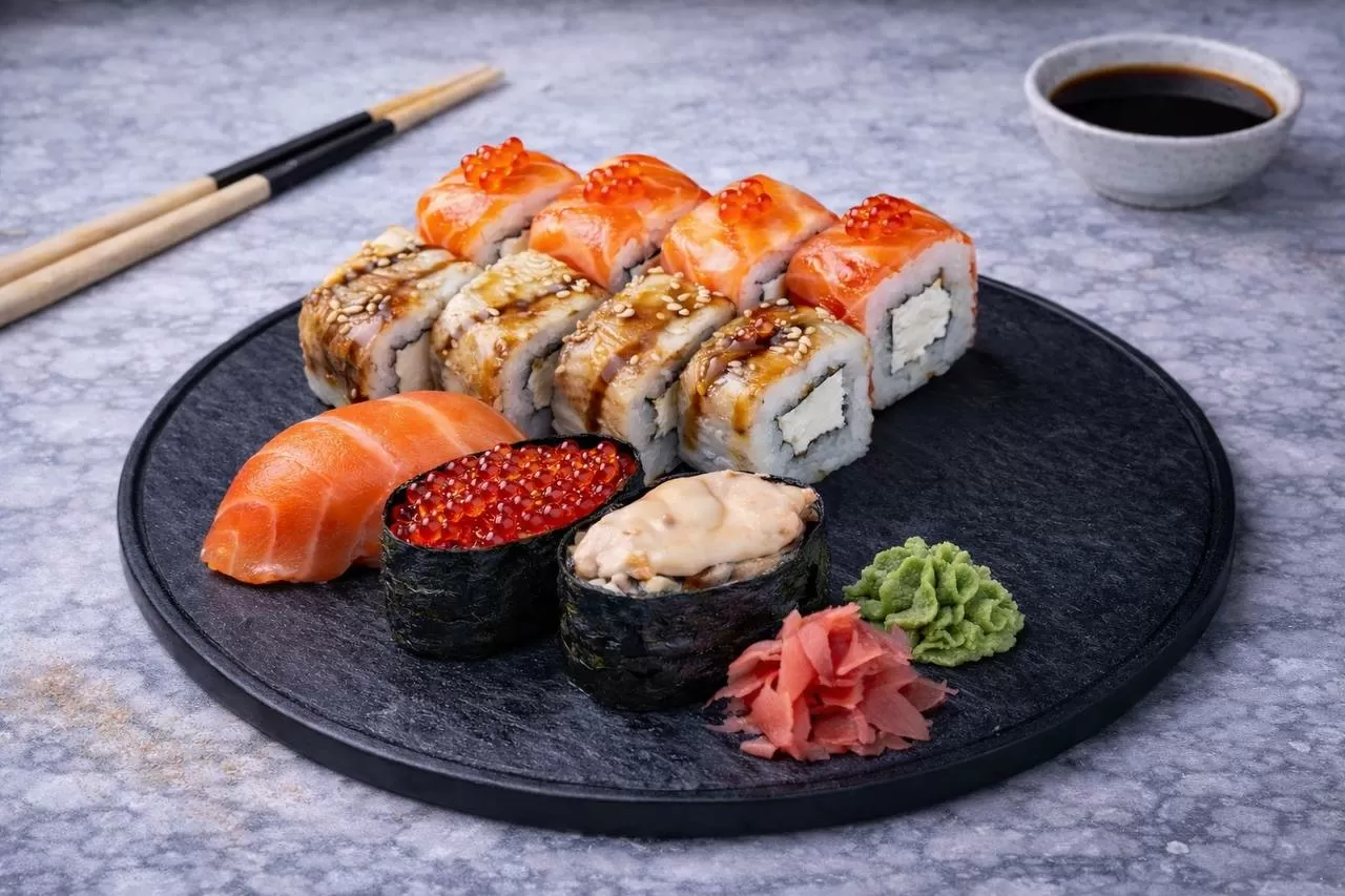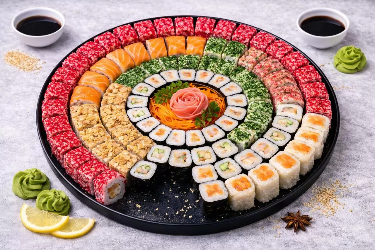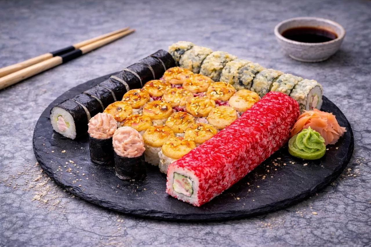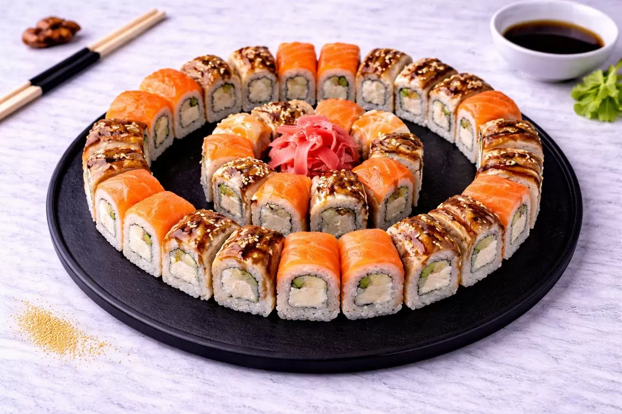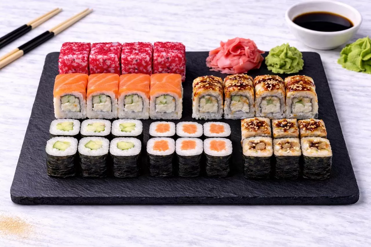 Роллы: Фреш ролл, Калифорния, Фудзи, Сяке кунсей маки, Буто маки, Лосось, Огурец.