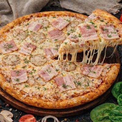 Пицца-соус, сыр моцарелла, чеснок, шампиньоны, нежное куриное филе, бекон, свежая зелень