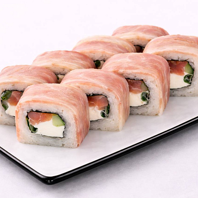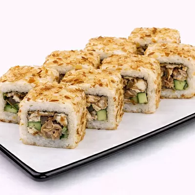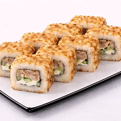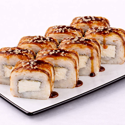 Состав: Куриное филе, сыр филадельфия, сыр моцарелла, помидор, стружка тунца, сырный соус, унаги соус, кунжут белый.