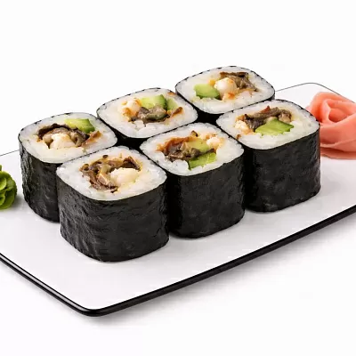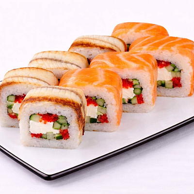 Роллы: 1/2 калифорния с крабом, 1/2 калифорния с лососем, 1/2 калифорния с угрем, 1/2 калифорния с креветкой