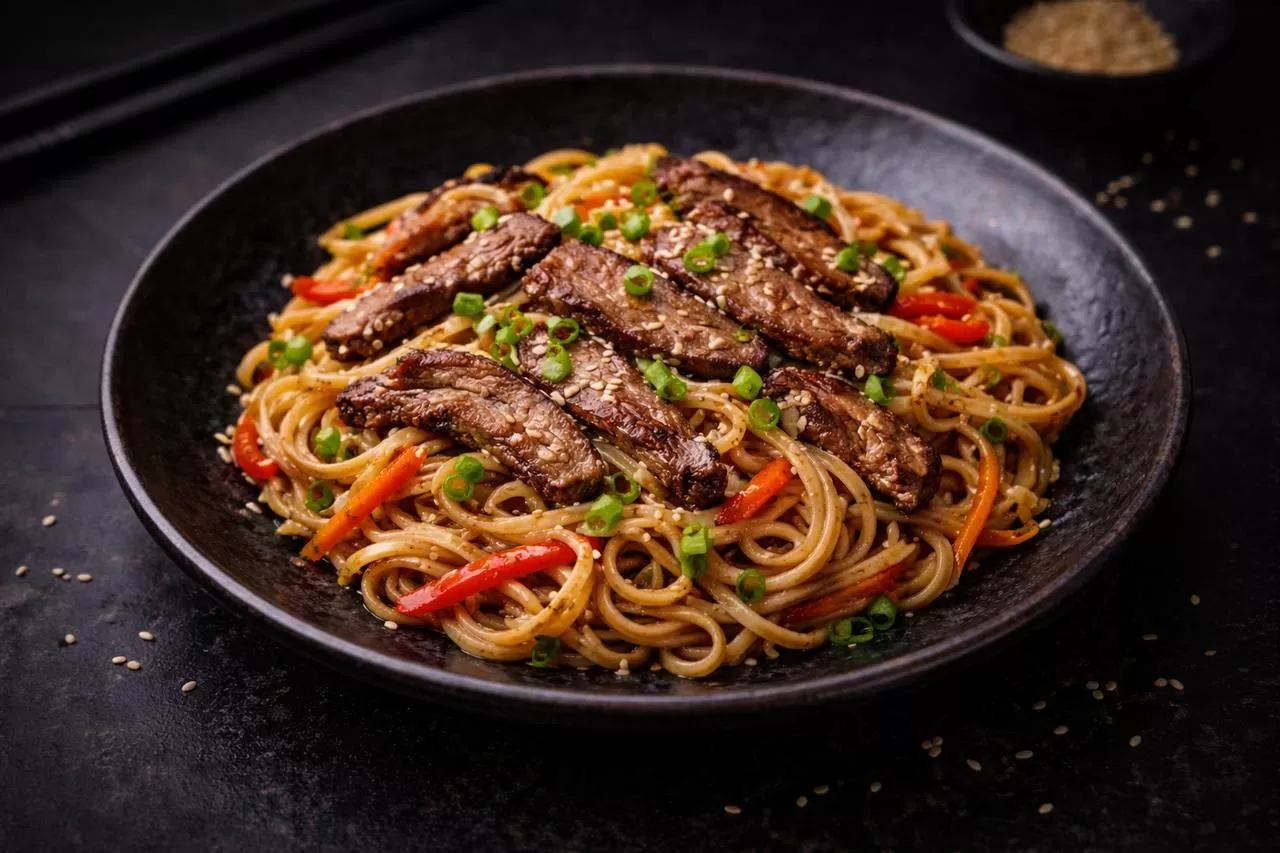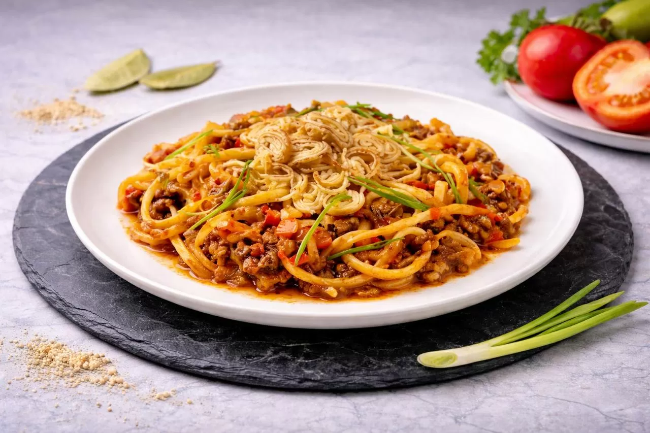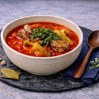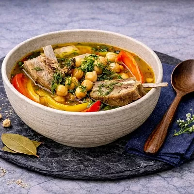 Сочная баранина, обжаренная с овощами и ароматными специями с густым бульоном и лапшой, приготовленной вручную, подается с аджикой.