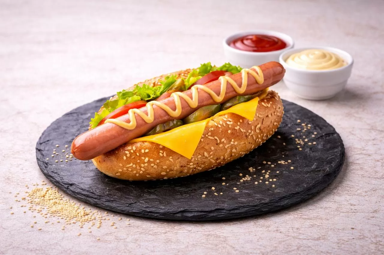 Булочка, говядина, помидор, огурец, соус красный, соус белый