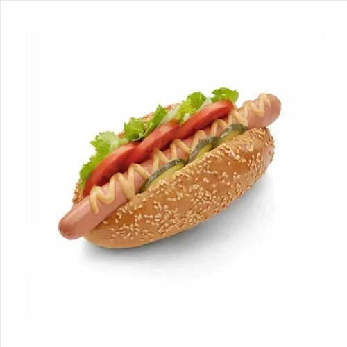 Котлета, бургер соус, лист салата, соленый огурчик, лук маринованный, горчица, кетчуп, свежий помидор