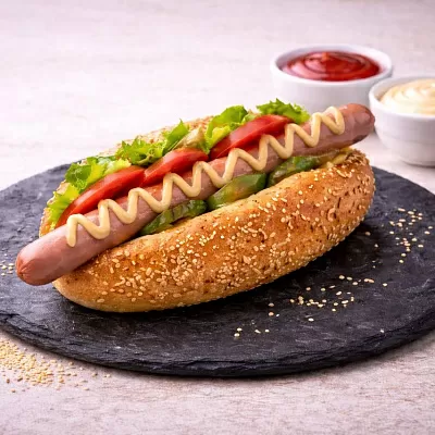Булочка, куриное филе, огурец, помидоры, соус красный, соус белый