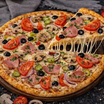 Пицца-соус, шампиньоны, сыр моцарелла, свинина, маслины, лук, томаты, свежая зелень