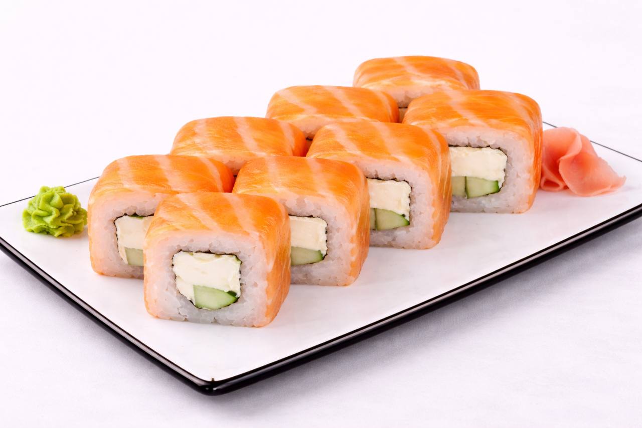 Сыр филадельфия, огурец, лосось, кунжут.